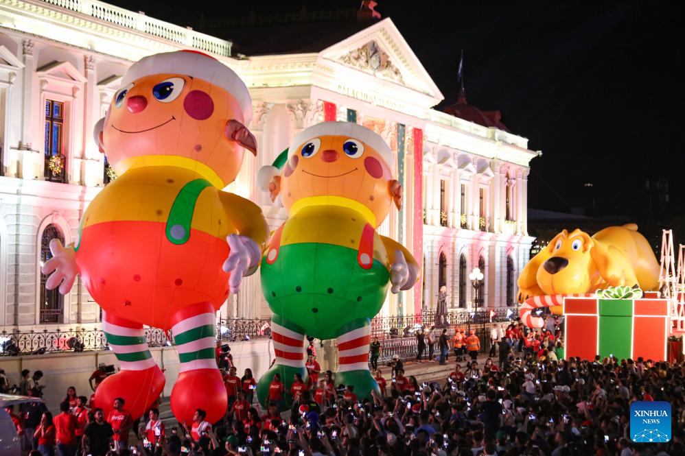 SAN SALVADOR, 22 diciembre, 2025 (Xinhua) -- Imagen del 21 de diciembre de 2025 de personas observando un globo gigante con la figura de Santa Claus frente al Palacio Nacional durante la segunda edición del Desfile de Globos Gigantes en el Centro Histórico, en el departamento de San Salvador, capital de El Salvador. (Xinhua/Alexander Peña)