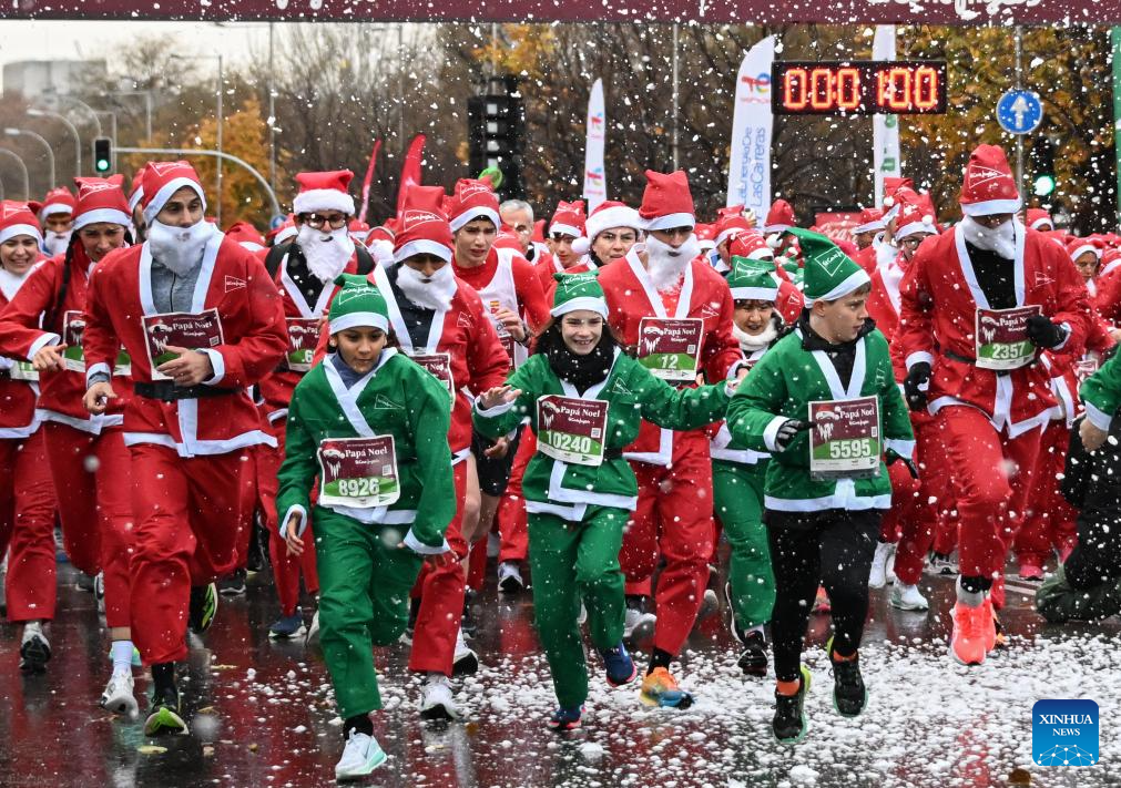 MADRID, 22 diciembre, 2025 (Xinhua) -- Imagen del 21 de diciembre de 2025 de corredores disfrazados como Santa Claus asistiendo a un evento de carreras con temática navideña, en Madrid, España. (Xinhua/Cheng Min)
