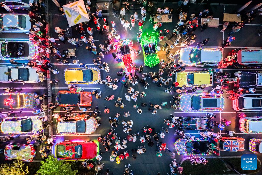 JOHANNESBURGO, 22 diciembre, 2025 (Xinhua) -- Vista aérea tomada con un dron el 22 de diciembre de 2025 de vehículos con decoraciones con temática navideña, en Johannesburgo, Sudáfrica. Johannesburgo se ha llenado de un ambiente festivo a medida que se acerca la Navidad. (Xinhua/Shiraaz Mohamed)