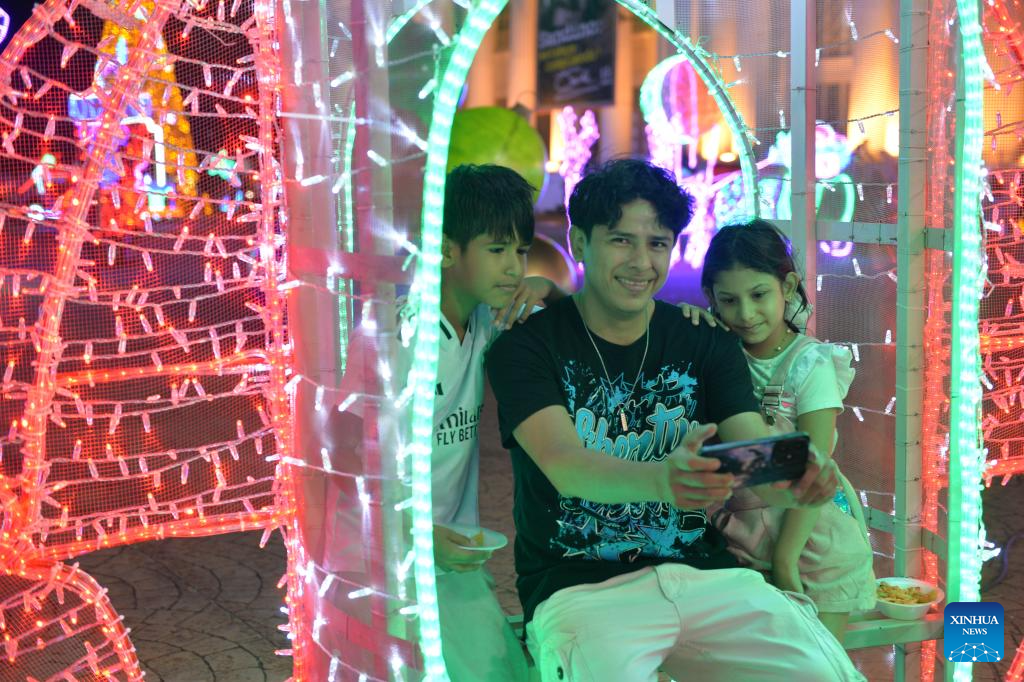 MANAGUA, 23 diciembre, 2025 (Xinhua) -- Imagen del 21 de diciembre de 2025 de personas posando para una fotografía en una instalación de luz por la temporada navideña, en Managua, Nicaragua. (Xinhua/Noelia Aráuz)