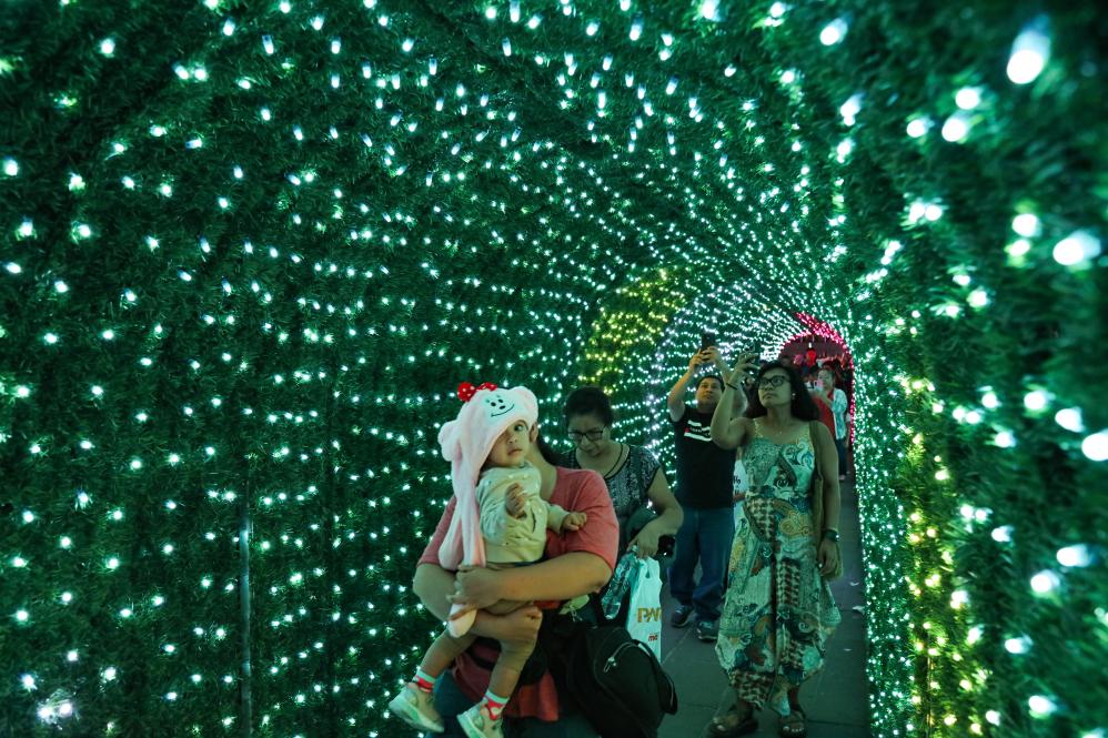 SAN SALVADOR, 24 diciembre, 2025 (Xinhua) -- Imagen del 23 de diciembre de 2025 de personas caminando a través de una instalación de luces navideñas durante la temporada navideña, en el departamento de San Salvador, El Salvador. (Xinhua/Alexander Peña)