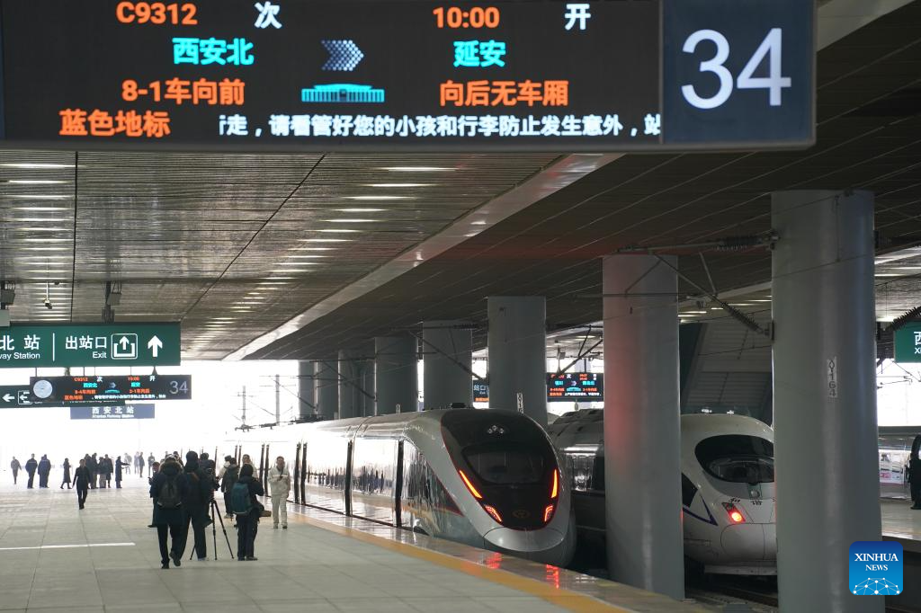 XI'AN, 26 diciembre, 2025 (Xinhua) -- Imagen del 26 de diciembre de 2025 del C9312, el primer tren de línea ferroviaria de alta velocidad Xi'an-Yan'an con destino a Yan'an, en la Estación de Ferrocarril del Norte de Xi'an, en Xi'an, en la provincia de Shaanxi, en el noroeste de China. Un estilizado tren bala plateado partió el viernes de Yan'an, en la provincia noroccidental china de Shaanxi, para conectar así el sagrado corazón revolucionario de China con la red ferroviaria de alta velocidad del país, que se encuentra en rápida expansión. (Xinhua/Shao Rui)