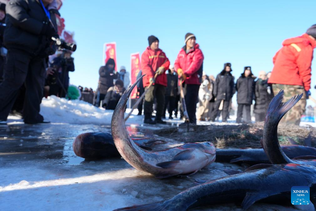 DAQING, 27 diciembre, 2025 (Xinhua) -- Imagen del 27 de diciembre de 2025 de un evento de pesca de invierno de una feria de Nadam sobre el congelado lago Lianhuan, en el distrito autónomo mongol de Dorbod, en la ciudad de Daqing, en la provincia de Heilongjiang, en el noreste de China. Una feria de Nadam de hielo y nieve con pesca de invierno comenzó aquí el sábado. El desarrollo integrado de la industria pesquera, cultural y turística en Dorbod no solo ha impulsado el mercado turístico, sino que también ha incrementado los ingresos de los pescadores locales. (Xinhua/Wang Song)