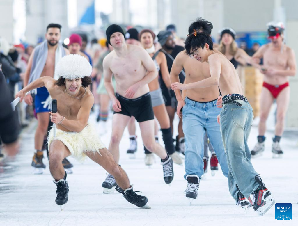 TORONTO, 29 diciembre, 2025 (Xinhua) -- Imagen del 28 de diciembre de 2025 de personas portando traje de baño mientras participan en el evento Patinaje del Oso Polar de Toronto 2025, en Toronto, Canadá. Alrededor de 160 patinadores participaron el domingo en este evento anual para despedir el año 2025. (Xinhua/Zou Zheng)