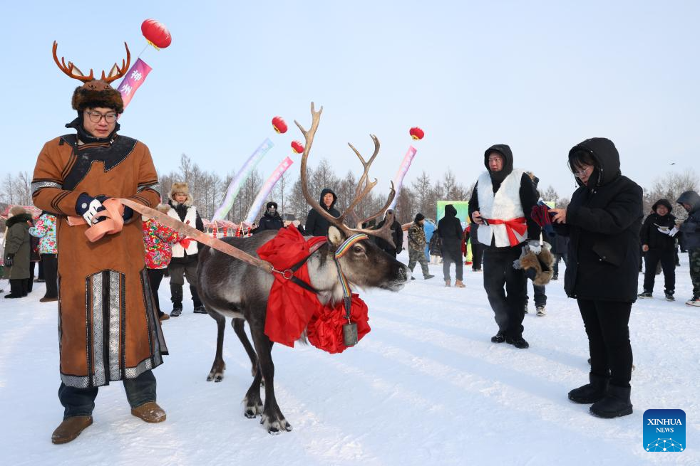 MOHE, 30 diciembre, 2025 (Xinhua) -- Turistas interactúan con un reno durante un evento de pesca invernal, en Mohe, en la provincia de Heilongjiang, en el noreste de China, el 30 de diciembre de 2025. El evento celebrado el martes mostró algunas costumbres y artes folclóricas que solo se encuentran en Mohe. (Xinhua/Shao Tianli)