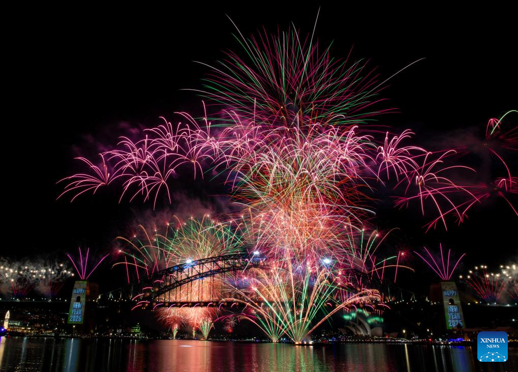 SIDNEY, 31 diciembre, 2025 (Xinhua) -- Fuegos artificiales explotan para celebrar el Año Nuevo en el Puente del Puerto, en Sídney, Australia, el 1 de enero de 2026. (Xinhua/Ma Ping)
