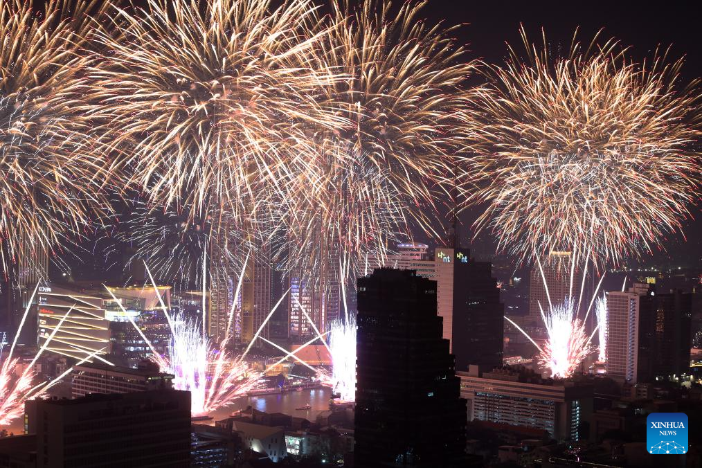 BANGKOK, 31 diciembre, 2025 (Xinhua) -- Fuegos artificiales explotan sobre el río Chao Phraya en celebración del Año Nuevo, en Bangkok, Tailandia, el 1 de enero de 2026. (Xinhua/Rachen Sageamsak)