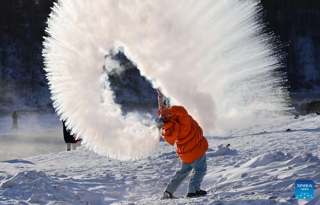 ARXAN, 1 enero, 2026 (Xinhua) -- Un turista juega a "agua a hielo" salpicando agua en el aire frío junto al río Halha, en la ciudad de Arxan de la Liga de Hinggan, en la región autónoma de Mongolia Interior, en el norte de China, el 1 de enero de 2026. A pesar del gélido frío invernal de Arxan, esta sección del río Halha, afectada por la geotermia, nunca se congela, lo que atrae a una gran cantidad de turistas en invierno. (Xinhua/Wang Zheng)