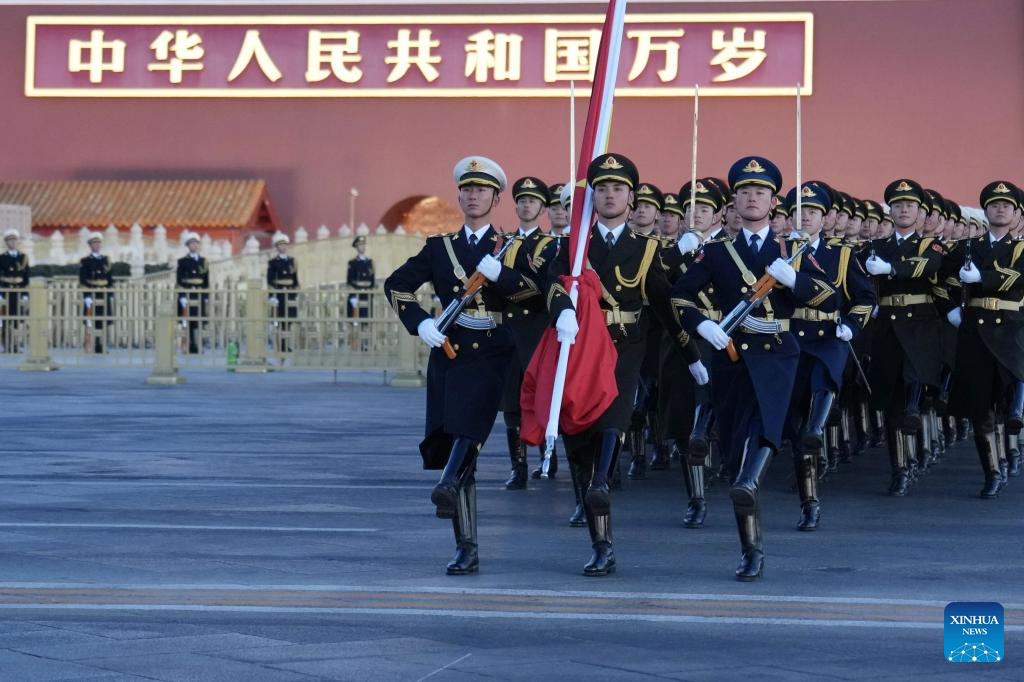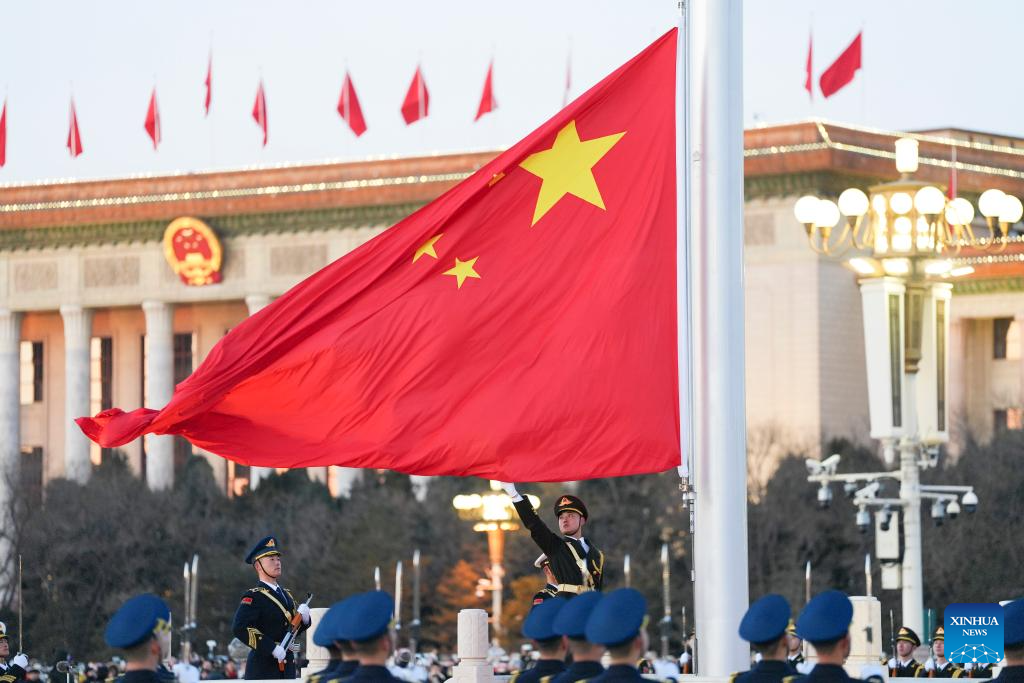 BEIJING, 1 enero, 2026 (Xinhua) -- Una gran ceremonia de izamiento de la bandera nacional se lleva a cabo en la Plaza Tian'anmen, en Beijing, capital de China, el 1 de enero de 2026. (Xinhua/Ju Huanzong)
