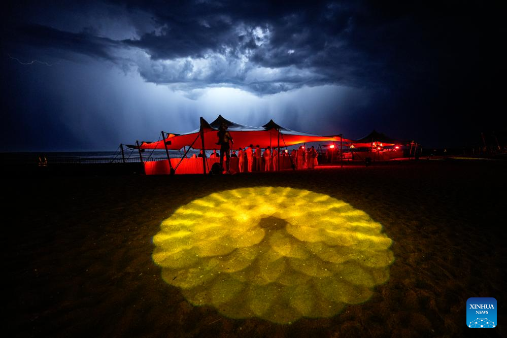 PUNTA DEL ESTE, 1 enero, 2026 (Xinhua) -- Personas se refugian de la lluvia durante una fiesta para dar la bienvenida al Año Nuevo en la playa en La Barra, en Punta del Este, Uruguay, el 1 de enero de 2026. (Xinhua/Nicolás Celaya)