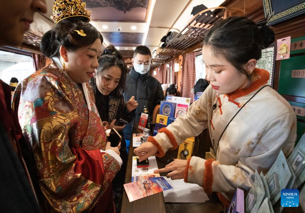 BEIJING, 1 enero, 2026 (Xinhua) -- Turistas compran sobres y postales conmemorativas en un tren temático que viaja de la Estación de Ferrocarril del Norte de Tianjin a la Estación de Ferrocarril de Beijing, el 1 de enero de 2026. El "Tianjin Fantasy Express" ha comenzado un servicio regular de ida y vuelta entre la Estación de Ferrocarril del Norte de Tianjin y la Estación de Ferrocarril de Beijing desde el jueves. La línea cuenta con 10 vagones con temáticas distintivas que combinan representaciones artísticas, presentaciones culturales y experiencias sobre el patrimonio cultural inmaterial. (Xinhua/Zhang Fan)