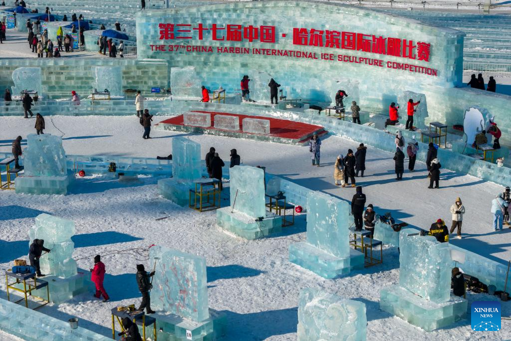 HARBIN, 2 enero, 2026 (Xinhua) -- Competidores trabajan en esculturas de hielo durante el 37 Concurso Internacional de Esculturas de Hielo de Harbin de China en el Mundo de Hielo y Nieve de Harbin, en Harbin, en la provincia de Heilongjiang, en el noreste de China, el 2 de enero de 2026. El concurso comenzó aquí el viernes. (Xinhua/Zhang Tao)