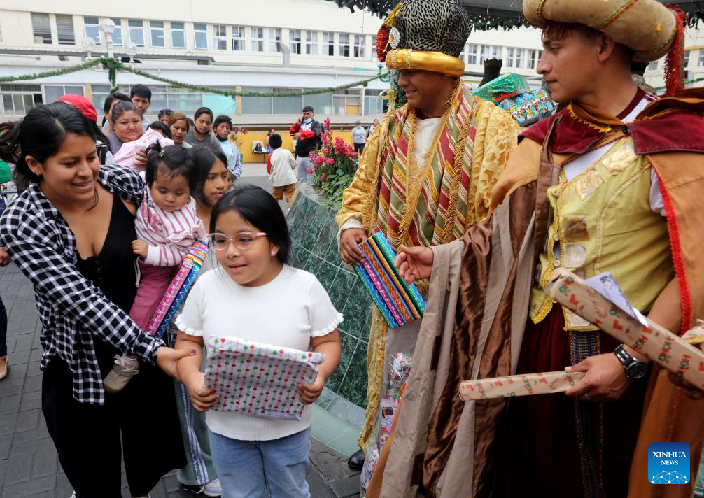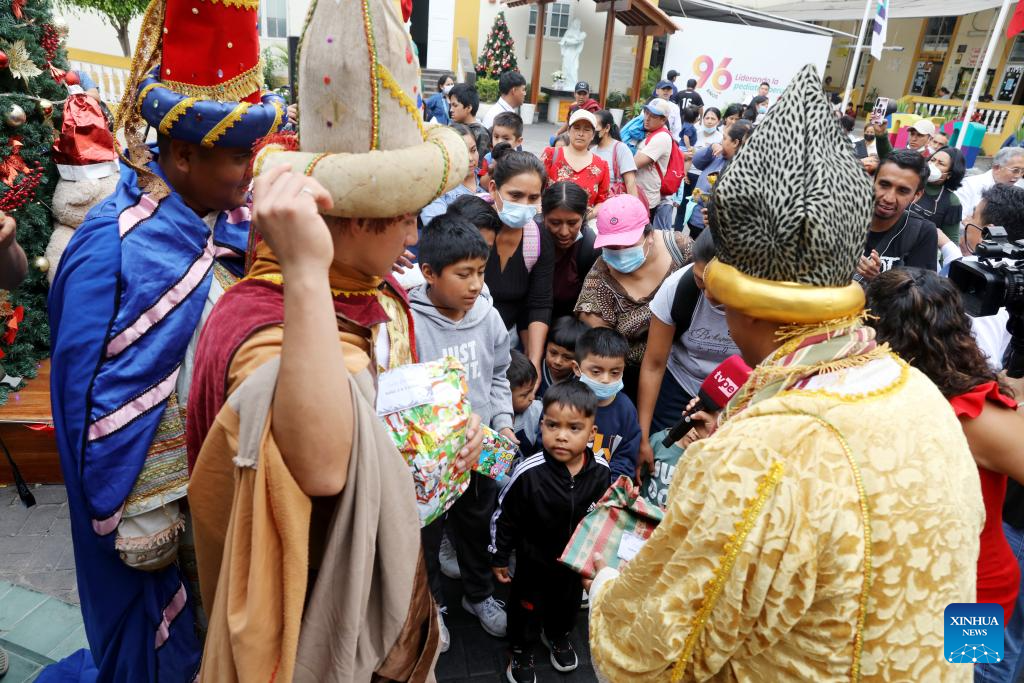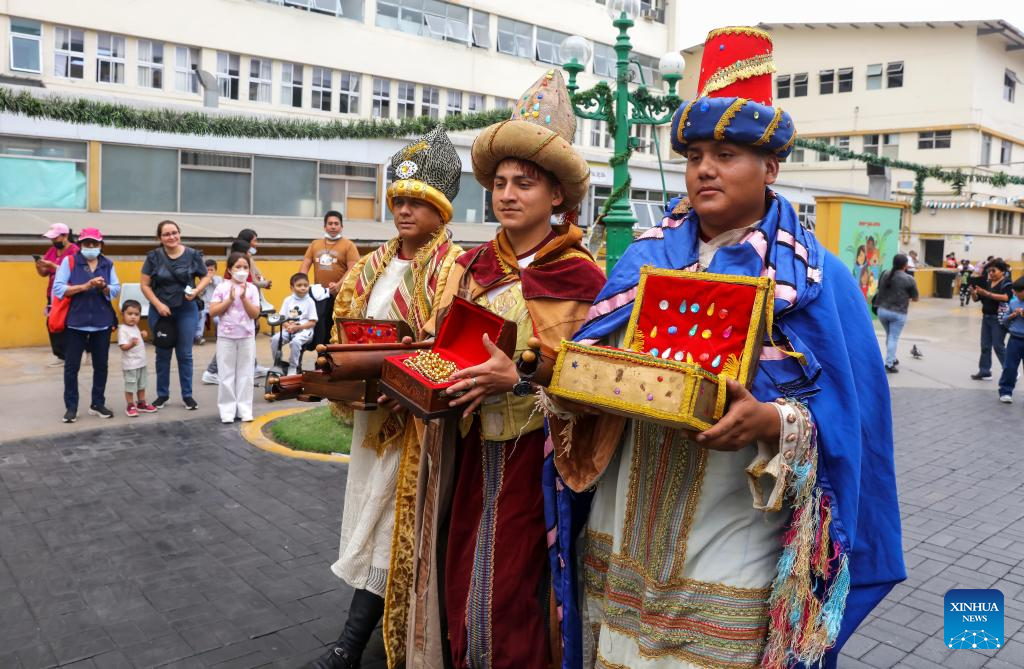 LIMA, 5 ene (Xinhua) -- Los Reyes Magos descendieron este lunes para traer alegría, ilusión y esperanza a niñas y niños que reciben atención médica o se encuentran internados en el Instituto Nacional de Salud del Niño (INSN) de Perú, en el marco de la tradicional Bajada de Reyes.