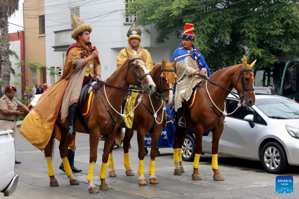Integrantes de la Unidad Histórica de la Policía Montada-Potao, disfrazados de Los Reyes Magos, llegan al Instituto Nacional de Salud del Niño (INSN) de Perú, en Lima, Perú, el 5 de enero de 2026. Los Reyes Magos descendieron el lunes para traer alegría, ilusión y esperanza a niñas y niños que reciben atención médica o se encuentran internados en el INSN de Perú, en el marco de la tradicional Bajada de Reyes. (Xinhua/Mariana Bazo)