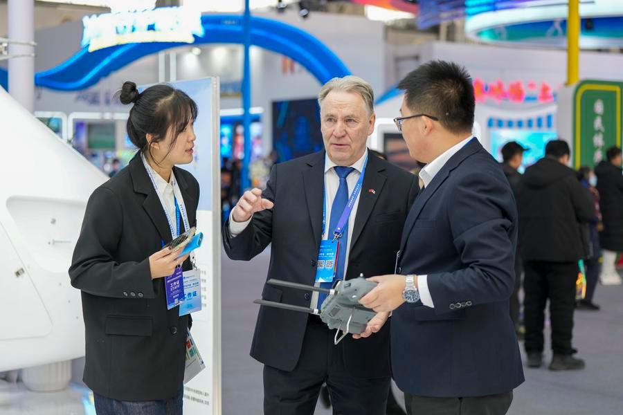 Yin Jingwei, rector de la Universidad de Ingeniería de Harbin, presentó las más recientes innovaciones tecnológicas del centro docente en la exposición, incluyendo vehículos aéreos no tripulados de operación polar y embarcaciones equipadas con sistemas de combustible polares.