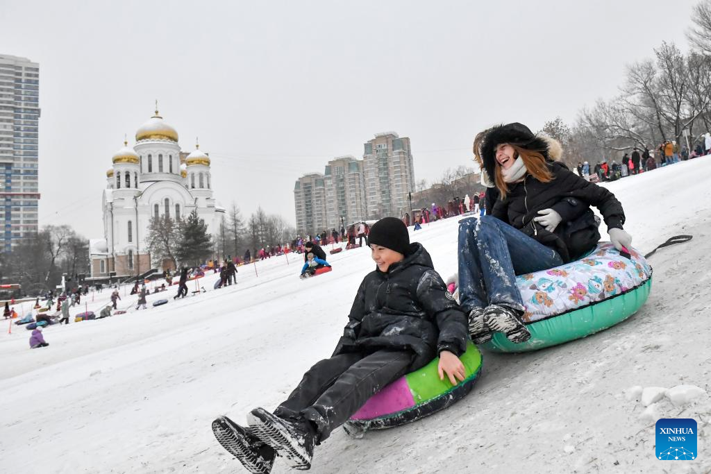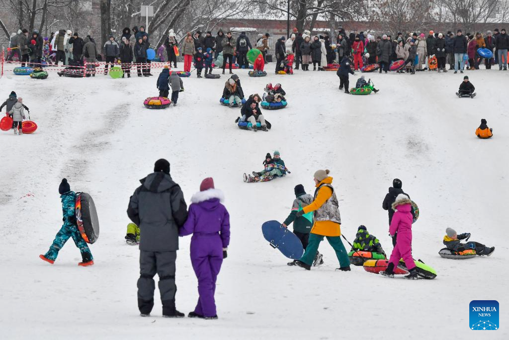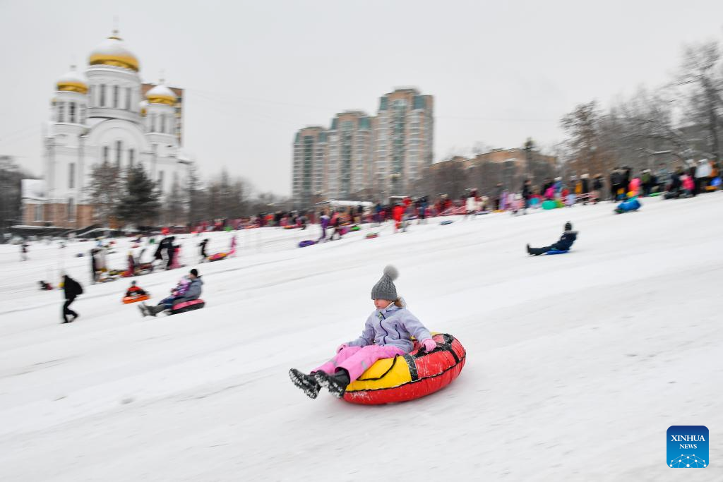 MOSCU, 7 enero, 2026 (Xinhua) -- Personas disfrutan deslizarse en trineo por la nieve en un parque, en Moscú, Rusia, el 7 de enero de 2026. (Xinhua/Alexander Zemlianichenko Jr)