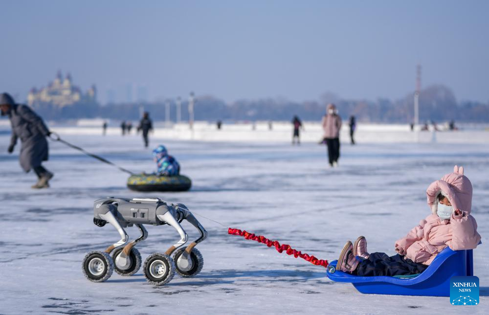 HARBIN, 11 enero, 2026 (Xinhua) -- Una niña circula en un trineo tirado por un perro robótico en la superficie congelada del Río Songhua, en Harbin, en la provincia de Heilongjiang, en el noreste de China, el 11 de enero de 2026. La superficie de la sección Harbin del río Songhua, ahora congelada sólidamente, sirve como un "campo de diversión", donde tanto los residentes como los turistas se divierten con atracciones con temas de hielo y nieve. (Xinhua/Wang Jianwei)