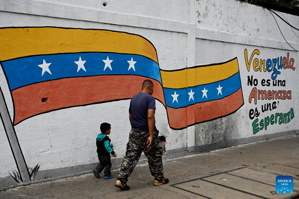 ANZOATEGUI, 11 enero, 2026 (Xinhua) -- Personas caminan frente a un mural, en el estado Anzoátegui, Venezuela, el 11 de enero de 2026. (Xinhua/Lucio Tavora)