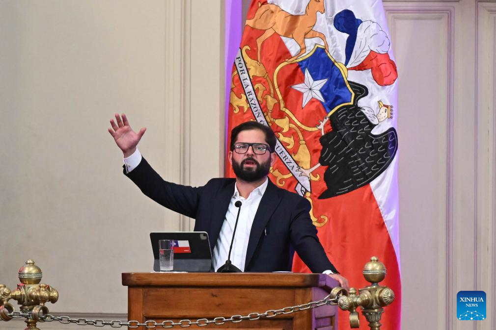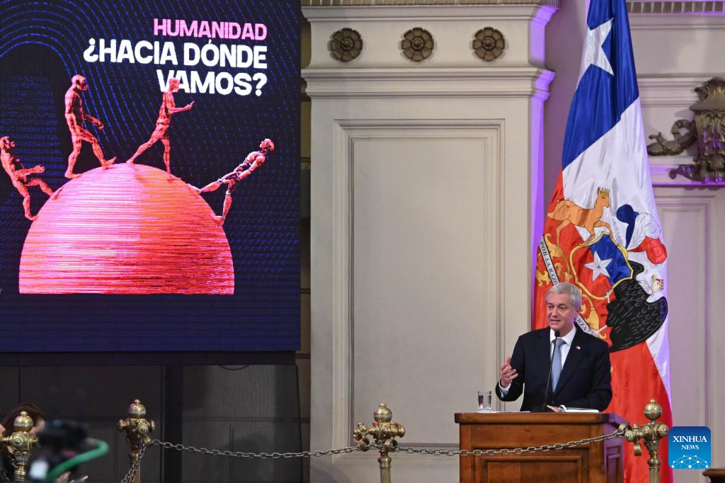 El presidente chileno, Gabriel Boric, pronuncia un discurso durante la inauguración de la decimoquinta edición del Congreso Futuro de Chile, en el Salón de Honor del Congreso Nacional de Santiago, en Santiago, capital de Chile, el 12 de enero de 2026. Autoridades y expertos llaman a pensar en tiempos complejos "hacia dónde vamos como humanidad", en el marco del arranque de la decimoquinta edición del Congreso Futuro de Chile, el espacio de encuentro de las ideas y el pensamiento de América Latina. (Xinhua/Jorge Villegas)