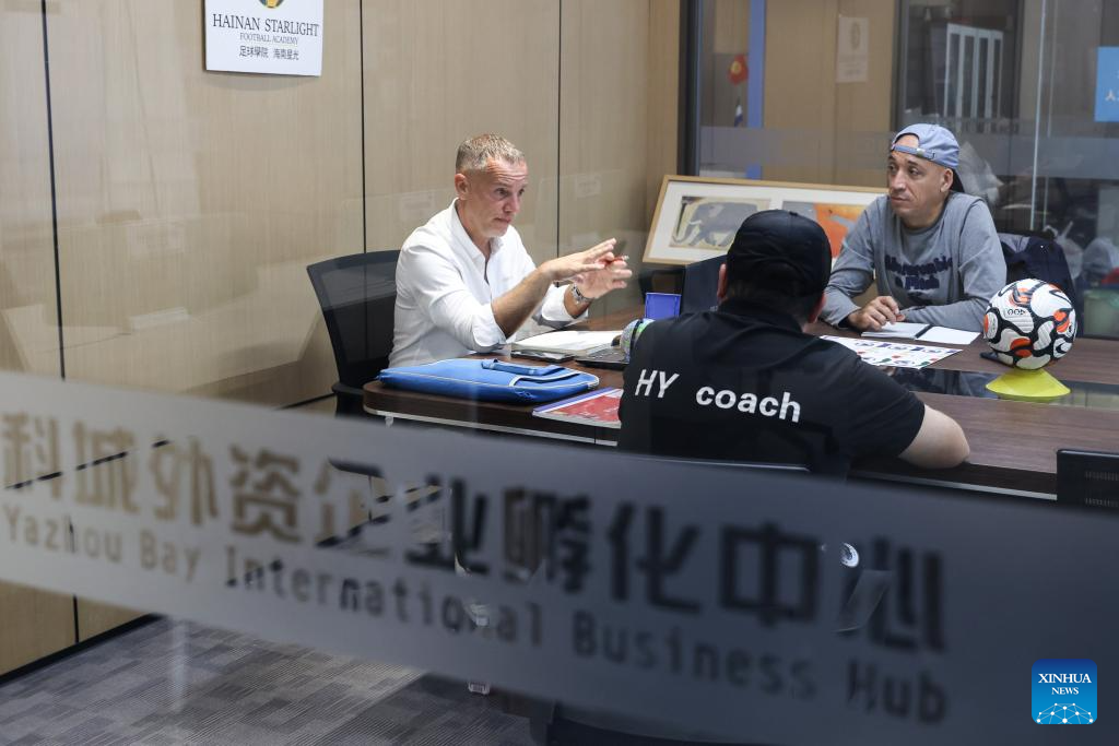 SANYA, 13 enero, 2026 (Xinhua) -- Imagen del 29 de noviembre de 2025 del francés Sebastien Brevot-Choplin (i), que lleva tres años dedicándose al entrenamiento de fútbol juvenil en Sanya, hablando con su colega en una empresa deportiva, en la bahía de Yazhou, en Sanya, en la provincia de Hainan, en el sur de China. Sebastien fue director técnico del campeón francés, Paris Saint-Germain, y ha dedicado muchos años al desarrollo del fútbol juvenil. Su carrera lo ha llevado a Egipto, Líbano, Tailandia, Marruecos y Canadá. "Siempre he trabajado con jugadores jóvenes", señaló. "Ahí es donde realmente comienza el fútbol". (Xinhua/Zhang Liyun)