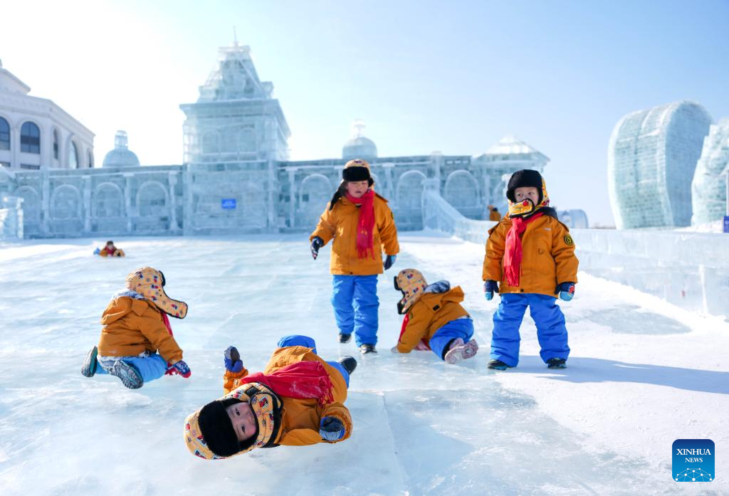 CHANGCHUN, 15 enero, 2026 (Xinhua) -- Imagen del 14 de enero de 2026 de niños jugando en un parque temático de hielo y nieve, en Changchun, en la provincia de Jilin, en el noreste de China. (Xinhua/Yan Linyun)