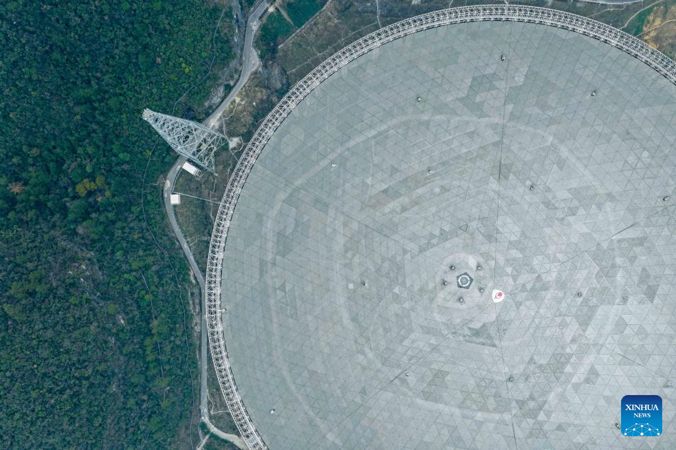 GUIYANG, 16 enero, 2026 (Xinhua) -- Vista panorámica aérea tomada con un dron el 16 de enero de 2026 del radiotelescopio esférico de apertura de 500 metros (FAST, por sus siglas en inglés) de China en mantenimiento, en la provincia de Guizhou, en el suroeste de China. Mediante el estudio de los datos proporcionados por las observaciones del gigantesco radiotelescopio de China, ubicado en la provincia de Guizhou, en el suroccidente del país, un equipo internacional de investigadores ha descubierto nuevas y convincentes evidencias que respaldan el origen en un sistema binario de al menos algunas ráfagas rápidas de radio, uno de los fenómenos más enigmáticos de la astrofísica moderna. (Xinhua/Ou Dongqu)