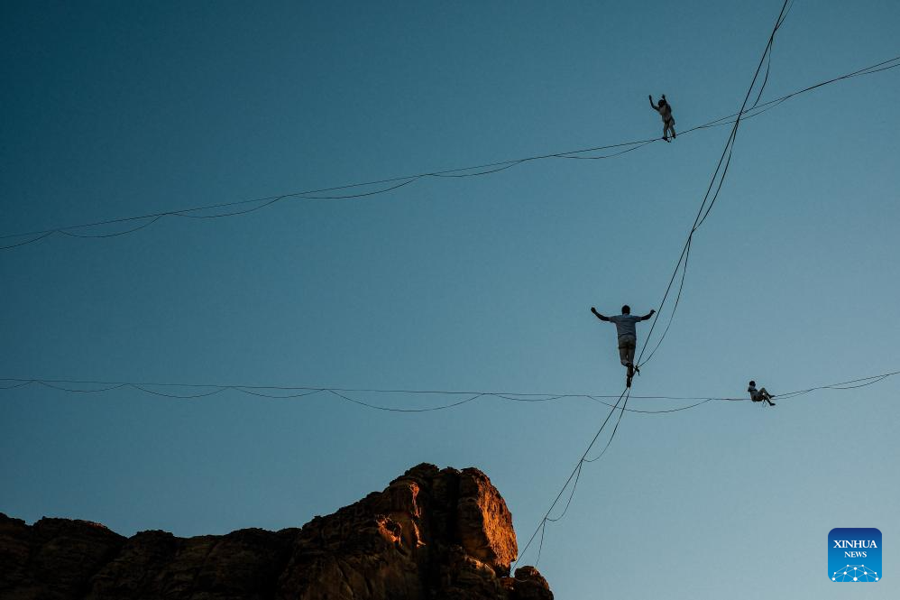 ALULA, 17 enero, 2026 (Xinhua) -- Imagen del 16 de enero de 2026 de acróbatas presentando un espectáculo de arte aéreo titulado Vértigo, en AlUla, Arabia Saudita. Presentado originalmente en París, Vértigo combina highlining, acrobacias y música inmersiva para explorar la gravedad, la autotrascendencia y el poder de la solidaridad a través de la interacción dinámica de los artistas con el espacio. (Xinhua/Xin Mengchen)