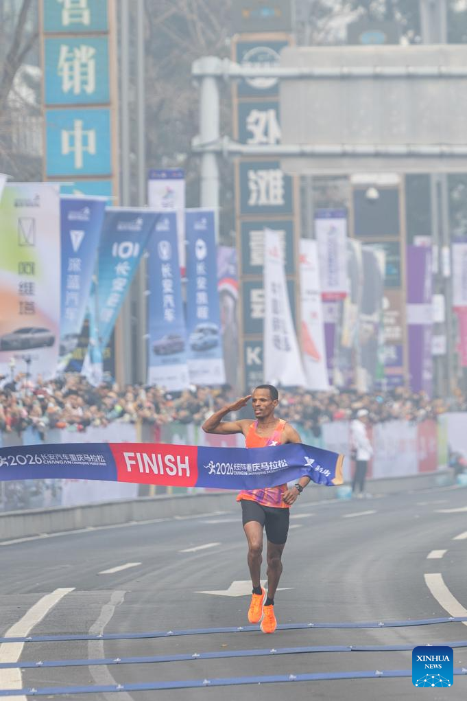 CHONGQING, 18 enero, 2026 (Xinhua) -- Adisu Tesfahun Tafere, de Etiopía, cruza la línea de meta y se proclama campeón masculino durante el Maratón de Chongqing 2026, en el distrito de Nan'an de la municipalidad de Chongqing, en el suroeste de China, el 18 de enero de 2026. Unos 25.000 corredores participaron en este evento deportivo celebrado aquí el domingo. (Xinhua/Huang Wei)