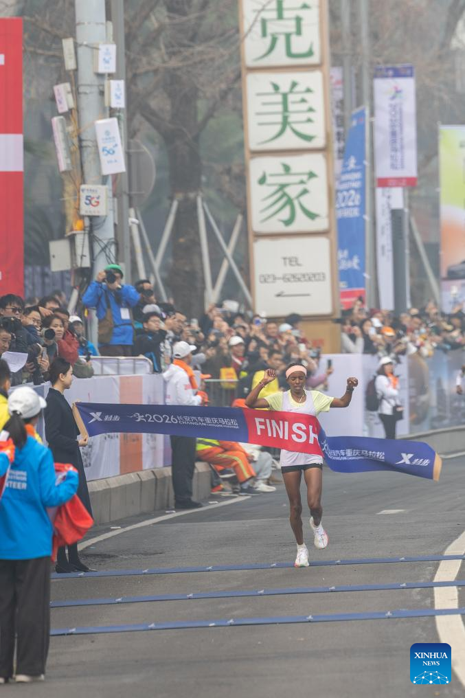 CHONGQING, 18 enero, 2026 (Xinhua) -- Kebebush Yisma Zewoldemariam, de Etiopía, cruza la línea de meta y se corona campeona femenina durante el Maratón de Chongqing 2026, en el distrito de Nan'an de la municipalidad de Chongqing, en el suroeste de China, el 18 de enero de 2026. Unos 25.000 corredores participaron en este evento deportivo celebrado aquí el domingo. (Xinhua/Huang Wei)