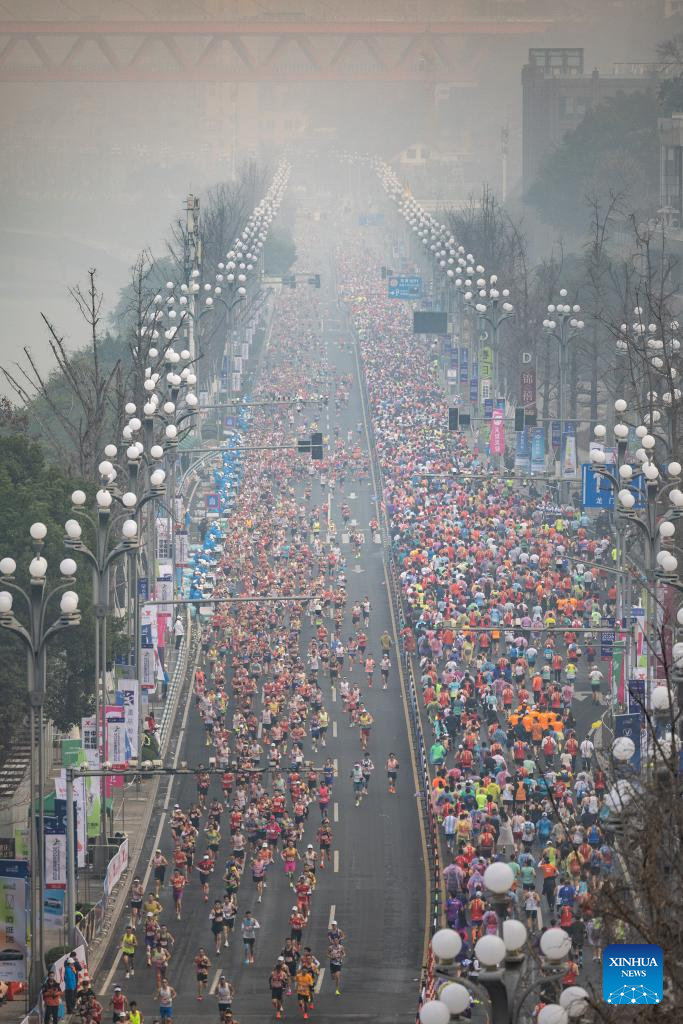 CHONGQING, 18 enero, 2026 (Xinhua) -- Competidores corren durante el Maratón de Chongqing 2026, en el distrito de Nan'an de la municipalidad de Chongqing, en el suroeste de China, el 18 de enero de 2026. Unos 25.000 corredores participaron en este evento deportivo celebrado aquí el domingo. (Xinhua/Huang Wei)