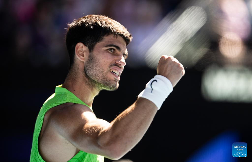 MELBOURNE, 23 enero, 2026 (Xinhua) -- Carlos Alcaraz, de España, festeja después de ganar el partido de tercera ronda de individuales masculinos ante Corentin Moutet, de Francia, en el torneo de tenis Abierto de Australia, en Melbourne, Australia, el 23 de enero de 2026. (Xinhua/Hu Jingchen)