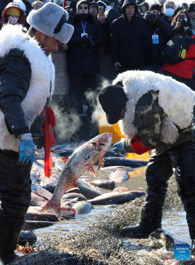 SHENYANG, 24 enero, 2026 (Xinhua) -- Trabajadores transfieren pescado recién capturado en el lago Wolong, en el distrito de Kangping de Shenyang, en la provincia de Liaoning, en el noreste de China, el 24 de enero de 2026. Un evento de pesca de invierno comenzó aquí el sábado, con presentaciones, gastronomía a base de pescado e instalaciones recreativas de hielo y nieve. (Xinhua/Han He)