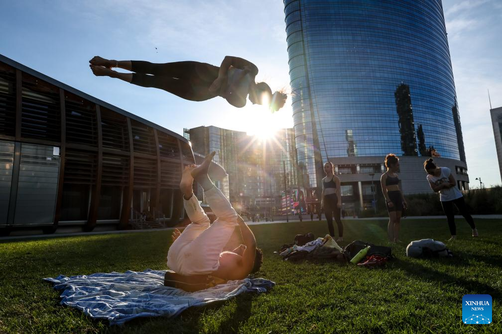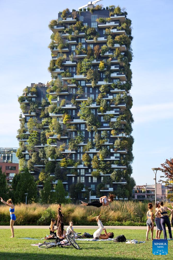 MILAN, 24 enero, 2026 (Xinhua) -- Imagen del 17 de septiembre de 2025 de personas practicando yoga acrobático cerca del Bosco Verticale, en Milán, Italia. Los Juegos Olímpicos de Invierno Milán-Cortina 2026 se celebrarán del 6 al 22 de febrero. (Xinhua/Li Jing)