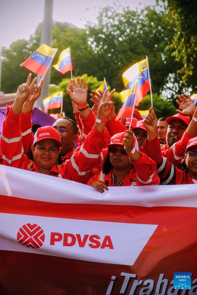 ANZOATEGUI, 25 enero, 2026 (Xinhua) -- Imagen proveída por la Presidencia de Venezuela de trabajadores petroleros participando en un acto, en Puerto La Cruz, en el estado Anzoátegui, Venezuela, el 25 de enero de 2026. La reforma de la Ley Orgánica de Hidrocarburos que impulsa el Gobierno de Venezuela servirá para la "felicidad económica" del país, afirmó el domingo la presidenta encargada, Delcy Rodríguez. (Xinhua/Presidencia de Venezuela)