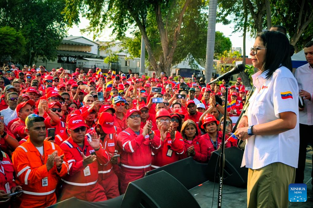 ANZOATEGUI, 25 enero, 2026 (Xinhua) -- Imagen proveída por la Presidencia de Venezuela de la presidenta encargada venezolana, Delcy Rodríguez (d-frente), participando en un acto en Puerto La Cruz, en el estado Anzoátegui, Venezuela, el 25 de enero de 2026. La reforma de la Ley Orgánica de Hidrocarburos que impulsa el Gobierno de Venezuela servirá para la "felicidad económica" del país, afirmó el domingo la presidenta encargada, Delcy Rodríguez. (Xinhua/Presidencia de Venezuela)