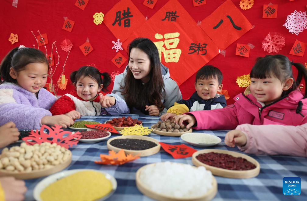 BEIJING, 26 enero, 2026 (Xinhua) -- Una profesora presenta los ingredientes para preparar gachas de Laba en un jardín de niños, en la ciudad de Linyi, en la provincia de Shandong, en el este de China, el 26 de enero de 2026. El Festival de Laba, que se celebra cada año el octavo día del duodécimo mes lunar con la costumbre de comer gachas de Laba, cae el lunes este año. (Xinhua/Wang Yanbing)