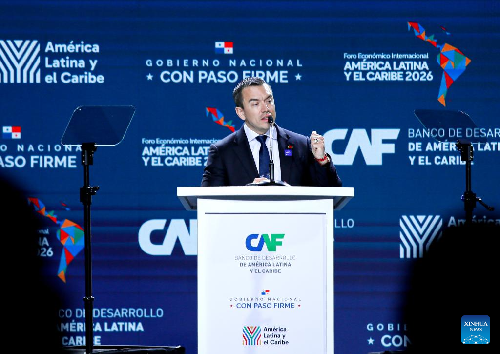 CIUDAD DE PANAMA, 28 enero, 2026 (Xinhua) -- El presidente ecuatoriano, Daniel Noboa, pronuncia un discurso durante el Foro Económico Internacional América Latina y el Caribe 2026 del Banco de Desarrollo de América Latina y el Caribe (CAF), en la Ciudad de Panamá, capital de Panamá, el 28 de enero de 2026. El Foro Económico Internacional América Latina y el Caribe 2026 del CAF se desarrolla en Panamá y cuenta con la participación de mandatarios y delegaciones de distintos países de América Latina y el Caribe, en un contexto marcado por la búsqueda de nuevas estrategias de cooperación e inserción regional en la economía global. (Xinhua/Daniel González)