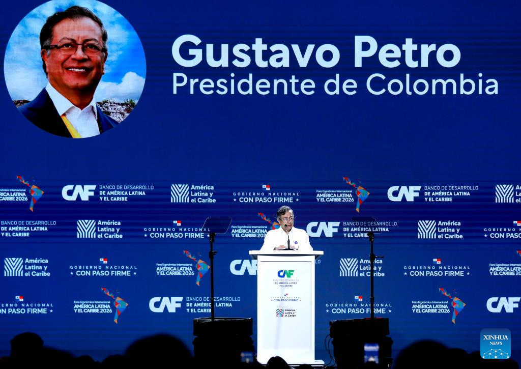 CIUDAD DE PANAMA, 28 enero, 2026 (Xinhua) -- El presidente colombiano, Gustavo Petro, pronuncia un discurso durante el Foro Económico Internacional América Latina y el Caribe 2026 del Banco de Desarrollo de América Latina y el Caribe (CAF), en la Ciudad de Panamá, capital de Panamá, el 28 de enero de 2026. El Foro Económico Internacional América Latina y el Caribe 2026 del CAF se desarrolla en Panamá y cuenta con la participación de mandatarios y delegaciones de distintos países de América Latina y el Caribe, en un contexto marcado por la búsqueda de nuevas estrategias de cooperación e inserción regional en la economía global. (Xinhua/Daniel González)