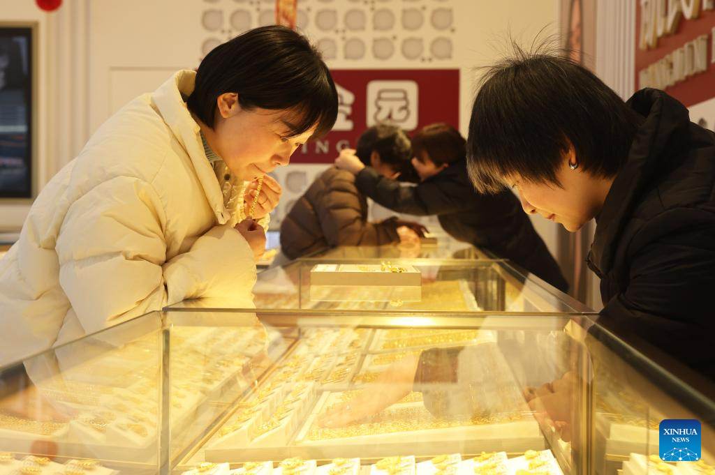 BEIJING, 29 enero, 2026 (Xinhua) -- Clientas seleccionan accesorios de oro en una tienda de oro, en el poblado de Yuyue, en la ciudad de Huzhou de la provincia de Zhejiang, en el este de China, el 29 de enero de 2026. Tanto el precio internacional del oro al contado como el precio de los futuros del oro en abril en la Bolsa Mercantil de Nueva York superaron el máximo histórico de 5.500 dólares estadounidenses por onza el 28 de enero. El precio del oro ha subido más de 500 dólares estadounidenses por onza en las últimas 72 horas, y el valor del mercado del oro se ha disparado en más de 3,5 billones de dólares estadounidenses. En total, el precio internacional del oro aumentó aproximadamente un 20 por ciento a principios de 2026. (Xinhua/Ni Lifang)