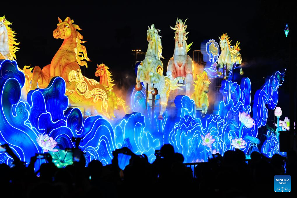 GUANGZHOU, 30 enero, 2026 (Xinhua) -- Imagen del 30 de enero de 2026 de un conjunto de linternas inspiradas en el caballo del zodíaco chino durante el espectáculo de linternas del Festival de la Primavera de Guangzhou 2026, en Guangzhou, en la provincia de Guangdong, en el sur de China. El evento comenzó el viernes en el parque Yuexiu en Guangzhou, con 85 grupos de exhibiciones de linternas distintivas repartidas por las diez principales áreas turísticas de todo el parque, y durará hasta el 8 de marzo. (Xinhua/Wang Ruiping)