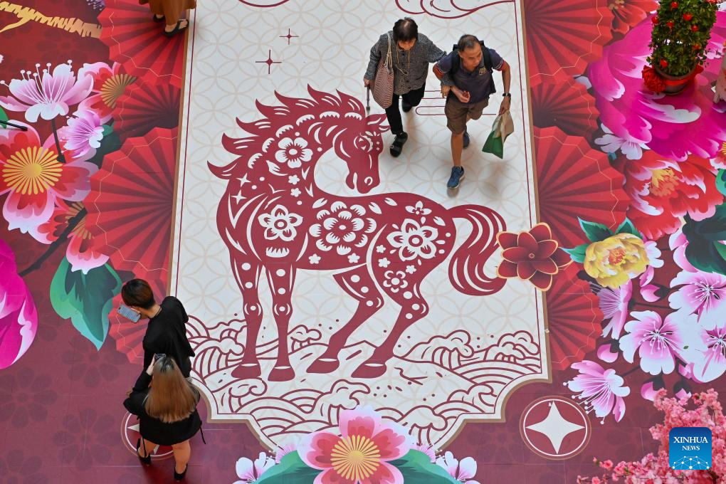 KUALA LUMPUR, 31 enero, 2026 (Xinhua) -- Imagen del 30 de enero de 2026 de visitantes caminando sobre una alfombra con el dibujo de un caballo para celebrar el Año del Caballo en un centro comercial, en Kuala Lumpur, Malasia. Recientemente se han montado instalaciones y decoraciones con temática de caballos para celebrar el próximo Año Nuevo chino en los principales centros comerciales de Malasia. (Xinhua/Chong Voon Chung)