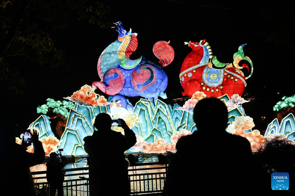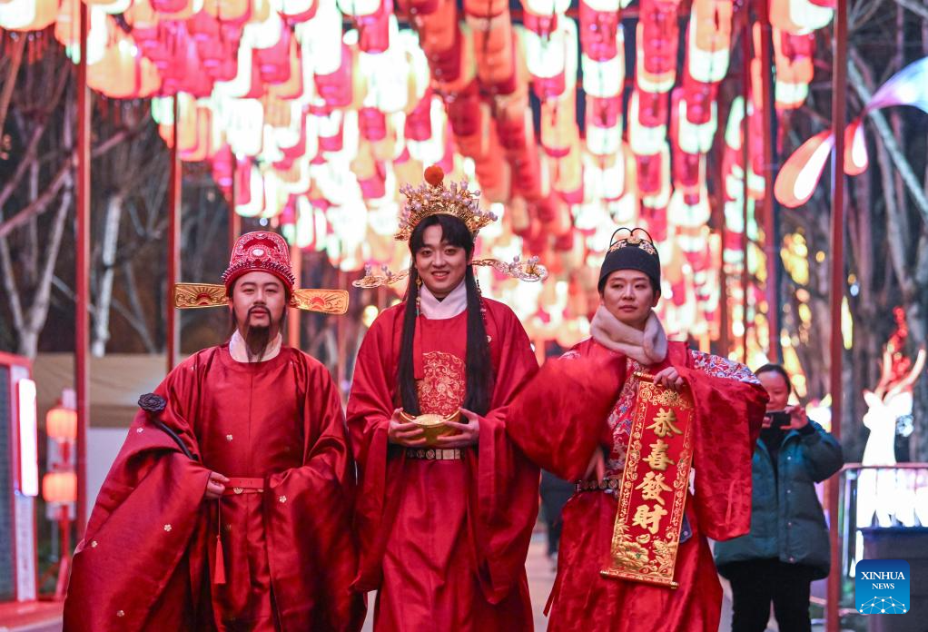 CHONGQING, 31 enero, 2026 (Xinhua) -- Imagen del 30 de enero de 2026 de trabajadores vestidos con trajes tradicionales interactuando con los visitantes en un festival de las linternas en el Garden Expo Park, en la municipalidad de Chongqing, en el suroeste de China. Las linternas de este festival para celebrar el próximo Año Nuevo chino se encendieron oficialmente el viernes, y durará hasta el 22 de marzo. (Xinhua/Chen Cheng)