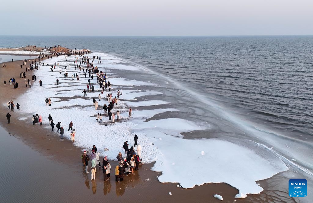 SHIJIAZHUANG, 1 febrero, 2026 (Xinhua) -- Imagen del 31 de enero de 2026 de turistas visitando una playa cubierta de hielo marino, en el distrito de Beidaihe de Qinhuangdao, en la provincia de Hebei, en el norte de China. (Xinhua/Yang Shiyao)