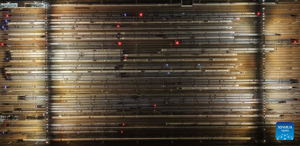 XI'AN, 1 febrero, 2026 (Xinhua) -- Vista aérea tomada con un dron el 1 de febrero de 2026 de trenes de alta velocidad preparándose para su operación, en Xi'an, en la provincia de Shaanxi, en el noroeste de China. (Xinhua/Zhang Wen)