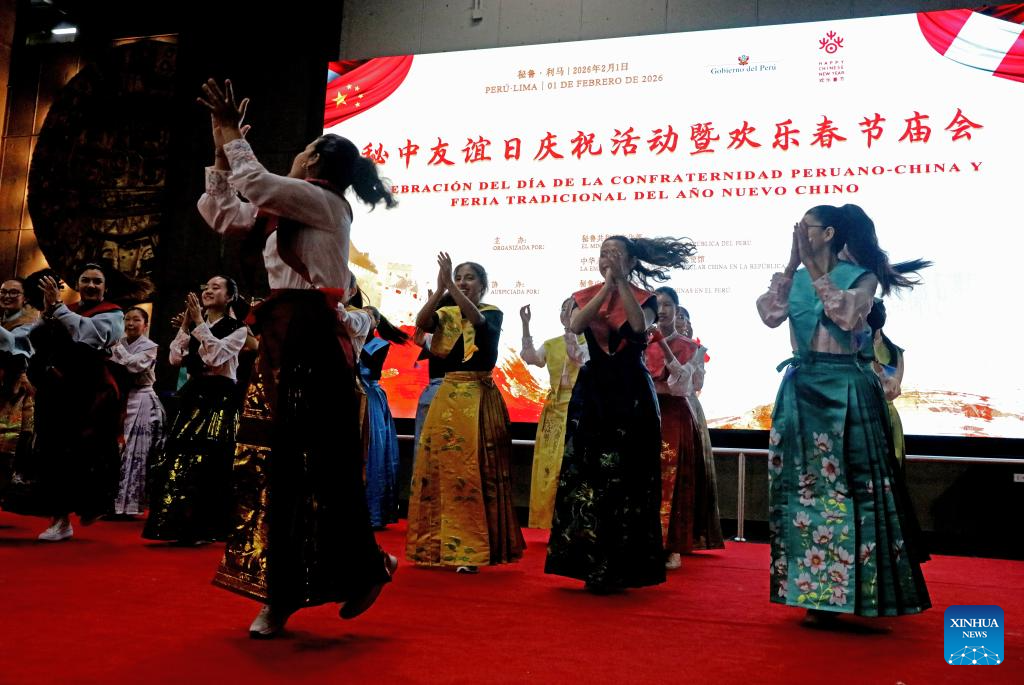 (260202) -- LIMA, 2 febrero, 2026 (Xinhua) -- Imagen del 1 de febrero de 2026 de estudiantes realizando una presentación de danza peruana durante la celebración del Día de la Confraternidad Peruano-China y la Feria Tradicional del Año Nuevo chino en el Ministerio de Cultura, en Lima, Perú. Peruanos vivieron el domingo un ambiente colorido y festivo durante la celebración del Día de la Confraternidad Peruano-China y la Feria Tradicional del Año Nuevo chino, realizada en las inmediaciones del Ministerio de Cultura en la ciudad de Lima. (Xinhua/Mariana Bazo)