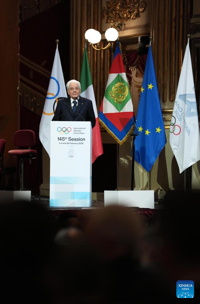 MILAN, 2 febrero, 2026 (Xinhua) -- El presidente italiano, Sergio Mattarella, pronuncia un discurso durante la ceremonia de apertura de la Sesión 145 del Comité Olímpico Internacional, en el Teatro La Scala, en Milán, Italia, el 2 de febrero de 2026. (Xinhua/Sun Fei)