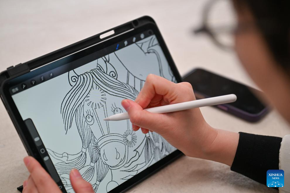 TIANJIN, 5 febrero, 2026 (Xinhua) -- Imagen del 4 de febrero de 2026 de Wang Yan, heredera de las pinturas de Año Nuevo de Yangliuqing, dibujando el manuscrito de una pintura de Año Nuevo con temática de caballos en la Editorial de Bellas Artes de Yangliuqing de Tianjin, en Tianjin, en el norte de China. Para celebrar el próximo Año del Caballo, la Editorial de Bellas Artes de Yangliuqing de Tianjin lanzó una serie de pinturas de Año Nuevo con temática de caballos, integrando técnicas tradicionales de pintura de Año Nuevo con diseño moderno. (Xinhua/Sun Fanyue)