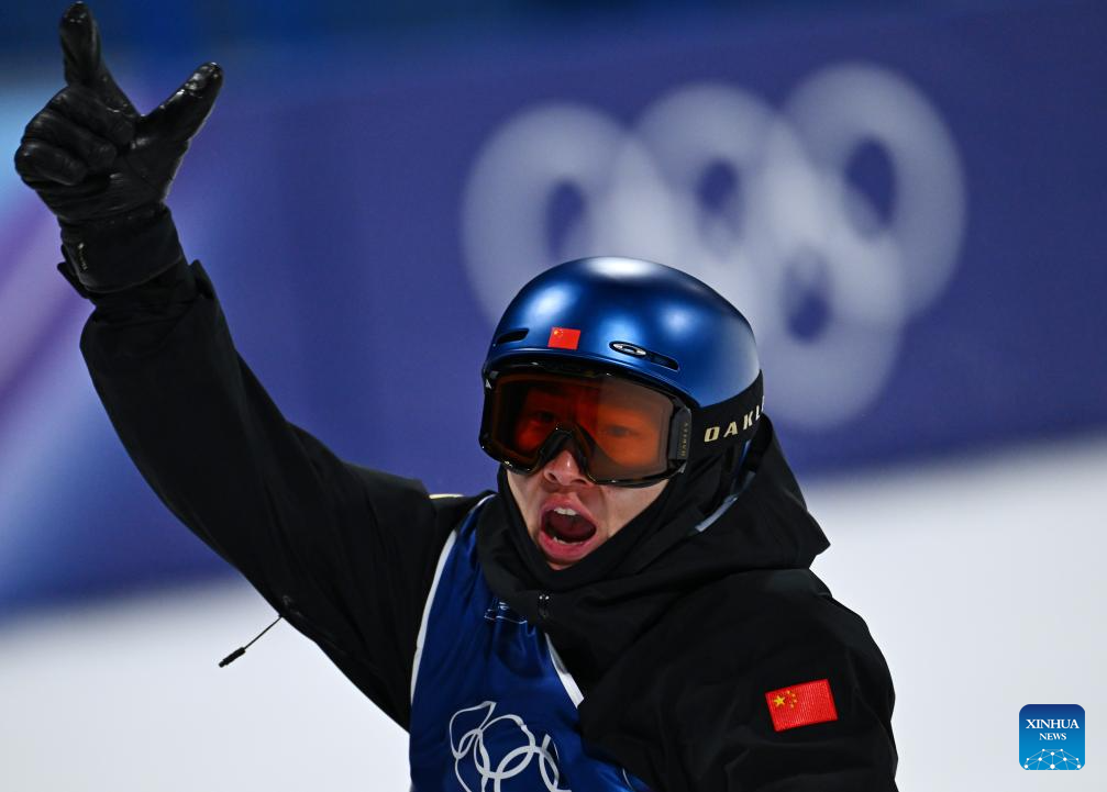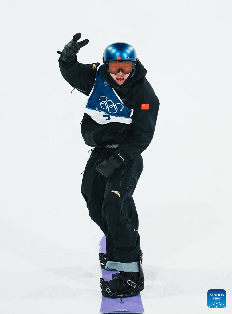LIVIGNO, 7 febrero, 2026 (Xinhua) -- Su Yiming, de China, festeja durante la final de Big Air masculino de Snowboard en los Juegos Olímpicos de Invierno Milán-Cortina 2026, en Livigno, Italia, el 7 de febrero de 2026. (Xinhua/Hu Chao)