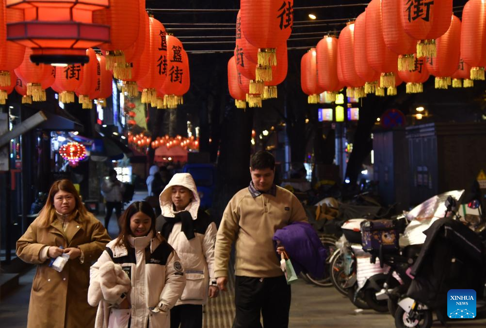 BEIJING, 8 febrero, 2026 (Xinhua) -- Imagen del 7 de febrero de 2026 de personas caminando bajo linternas colgadas para celebrar el Festival de la Primavera, en Beijing, capital de China. (Xinhua/Li Xin)