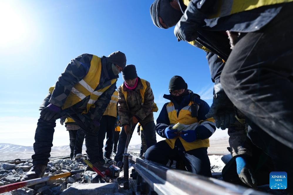 GOLMUD, 8 febrero, 2026 (Xinhua) -- Imagen del 6 de febrero de 2026 de empleados del taller de mantenimiento de la Línea de Wangkun en la sección de Golmud de China Railway Qinghai-Xizang Group Co., Ltd. realizando el mantenimiento de la vía a lo largo del Ferrocarril Qinghai-Xizang, en la provincia de Qinghai, en el noroeste de China. En lo profundo de las montañas Kunlun, los mecánicos de los talleres ferroviarios han intensificado el patrullaje en lugares clave a lo largo de las líneas ferroviarias, salvaguardando el buen funcionamiento del ferrocarril durante la temporada alta de viajes del Festival de la Primavera. (Xinhua/Qi Zhiyue)